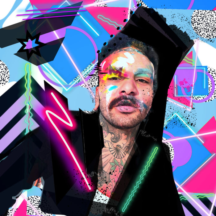 The portrait is loud in the right way: neon geometry, self-iconography, painterly intervention, and a face held at the center like a manifesto.